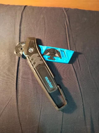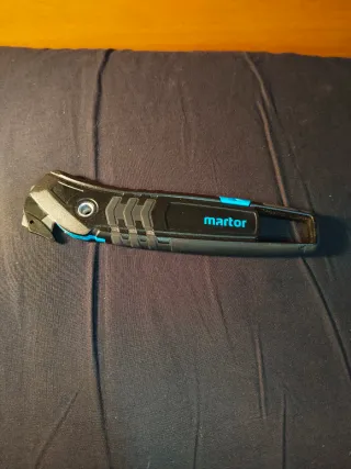 Cúter de seguridad de la marca Martor. Diseño ergonómico y seguro. - Mango de plástico resistente. - Hoja de corte retráctil. - Incluye recambio de hoja.