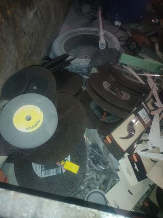 Lote de discos de corte y herramientas de ferretería usados. Ideales para proyectos de bricolaje o profesionales. - Incluye varios discos de corte de diferentes tamaños y marcas, algunos con señales de uso. - También se incluyen varias herramientas, algunas en su embalaje original. - Perfecto para quien busca un surtido de herramientas a buen precio.