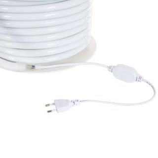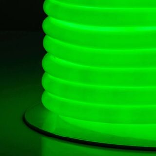 Rollo de tira LED de neón con acabado circular en color verde. - Longitud total de 25 metros. - Ideal para decoración y señalización.
