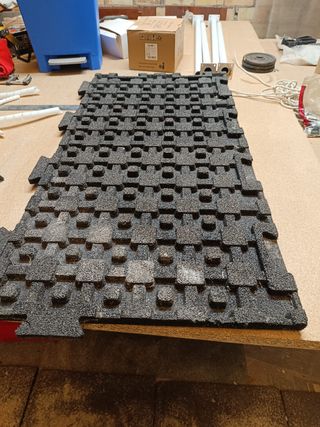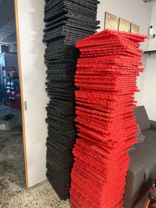 Pack de 240 baldosas, ideales para suelos de taller o garaje. 103 piezas son de color rojo y 137 de color negro. Medida de las piezas 40x40. Precio de mercado 1350€ Se vende por un precio de 600€ - Diseño de rejilla. - Material plástico resistente.