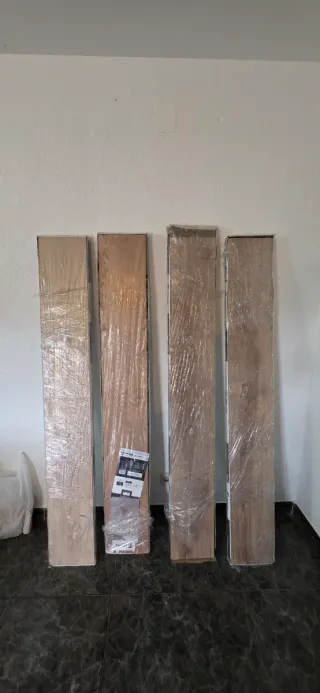 Se venden restos de suelo de madera, ideales para proyectos o reparaciones. Dos son del mismo color y los otros son restos que han quedado. El más claro tiene marcas visibles en la primera lama. 15 euros los 4. - Material: Madera - Color: Tono madera natural