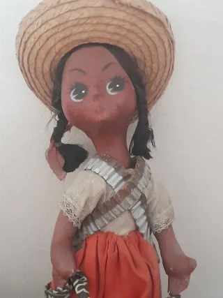 Preciosa muñeca mexicana "ADELITA" muy antigua del folclore militar de México. Elaboración totalmente artesanal con papel maché o cartón piedra. Mide 31 cm. Con su típico sombrero de paja, trenzas, rebozo o chal, enaguas, pantaloncillo o faldón y las cartucheras cruzadas en el pecho con munición de balas. Las muñecas llamadas "ADELITAS" o "SOLDADERAS" son muñecas de la artesanía popular de Méjico, que conmemoran a las valientes mujeres guerrilleras o milicianas que participaron activamente en la Revolución Mexicana. Suelen fabricarse artesanalmente y suelen incluir detalles como armas, rifles y cartucheras como parte de su vestiment