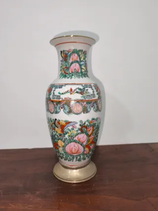 Jarrón de porcelana china decorado en el estilo tradicional Famille Rose. Se caracteriza por una paleta de colores suaves y detalles florales. Suelen presentar escenas de la vida cortesana china o motivos simbólicos. Medidas: 12cm ancho x 28cm alto.