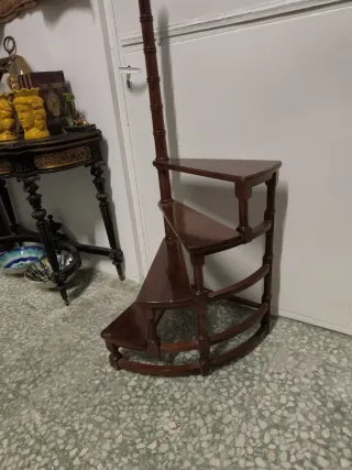 Escalera de biblioteca en madera patinada con cuatro peldaños. Barnizado caoba La barandilla superior es súper práctica para mantener la estabilidad mientras se sube, tiene forma de caña de bambú Mide 122'5cm de alto (64cm altura del suelo del último escalón) y 46'5*46'5 ancho. muy estable VDV778 Librería vintage libros boiserie despacho caracol escalones helicoidal antigua antigüedad antiguo vintage escalera auxiliar estantería aparador hanbel becara Borgia Conti Valentí Kartell Colombo Knoll Eames Breuer Bauhaus Borsani Foscarini Hansen Le Corbusier Gubi Alessi subasta Space Age Mid Century zara kave home sklum ikea sol cuero