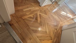Suelo de madera con acabado en espiga. El diseño en espiga crea un patrón clásico y elegante. - Material: Madera natural. - Patrón: Espiga.
