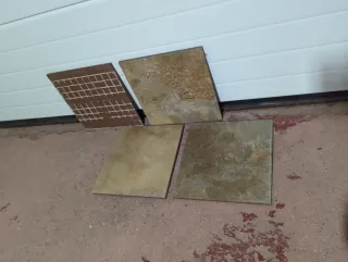 Lote de cuatro baldosas cerámicas con un diseño rústico y texturizado, ideal para suelos o paredes. - Medidas aproximadas: 33x33 cm. - Acabado mate. - Tonos tierra y grises.