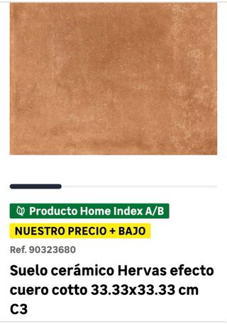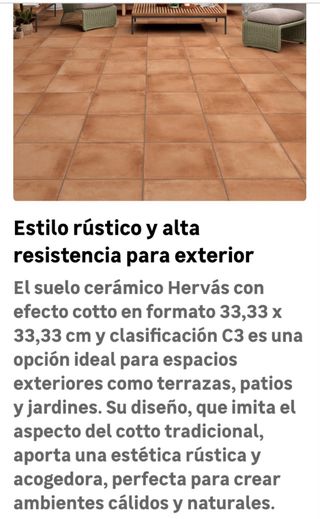 Pavimento fabricado en material porcelánico antideslizante y antihielo con acabado en color cotto. Indicado para suelo de interior y exterior, con los siguientes niveles de resistencia: 2/5 de desgaste y 8/9 de dureza. Medidas: 33,15 x 33,15 cm (ancho x largo) y un espesor de 7,6 mm. Capacidad de la caja: 1,32m², acabado mate tenemos 17m2 precio m2 12 euros
