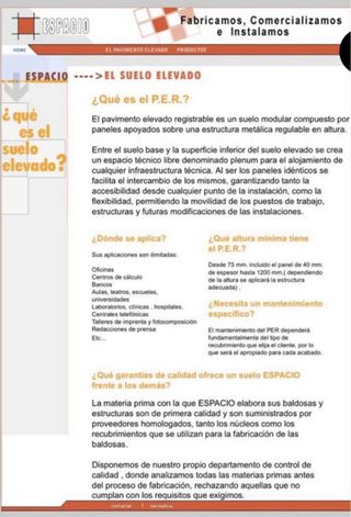 Suelo técnico en perfecto estado, son baldosas modulares de diferentes composiciones, ignífugas e inoxidables por debajo, ideal para instalaciones de oficinas, garajes, comerciales...de la marca ESPACIO. Color gris. -Sistema de acceso rápido para mantenimiento. -Superficie lisa y uniforme. -Fácil instalación y desmontaje. Dispongo de 154 unidades, que equivalen a unos 54 m2, regalo pedestales para su instalación y rejillas de aireación. Medidas baldosas: 60x60 y 4 cm de grosor. 4 rejillas/aireadores de las mismas medidas. Los pedestales van de mínima altura 5,5 y máxima altura 9,5 cm. 7€ por unidad llevando todas.