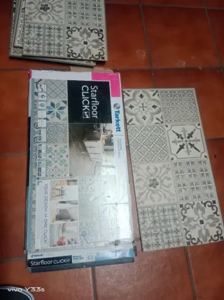 Suelo vinílico de la marca Tarkett, modelo Starfloor Click, con un diseño de mosaico. Hay una caja sin estrenar más 12 lamas usadas pero en buen estado - Diseño de mosaico. - Sistema de instalación Click. - Material vinílico.
