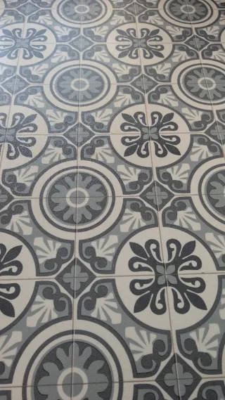 Se venden retales de suelo vinílico con diseño hidráulico. - Diseño de baldosas hidráulicas. - Tonos grises y blancos.