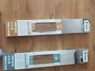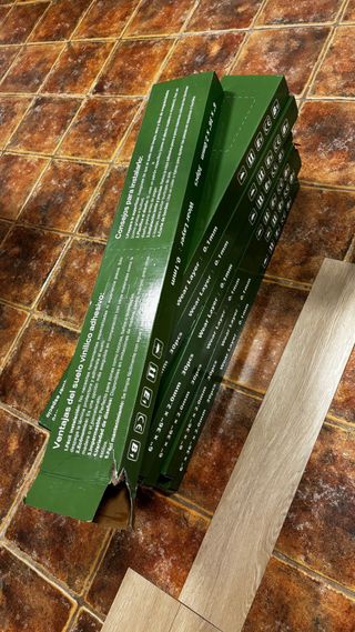 Se venden cajas de suelo vinílico en formato click de espiga. Con base aislante integrada y de uso intensivo extrem y resintente al agua. Disponible 47 m2 con un precio de 23€ m2. Actualmente en el leroy merlin tiene un precio de 29,99€ m2. En caso de hacer falta mas metros podeis conseguirlos en el leroy Merlin. (Suelo vinilico Espi Malte) Con un coste total de 1081€ los 47m2 - Modelo: RIGID SPC - Marca: Vertens - Color: Madera - Fácil instalación