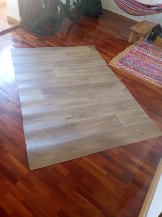 Suelo vinílico que imita la madera, ideal para darle un toque elegante a tu hogar. Se encuentra en buen estado. 10€/ m2 - Fácil de instalar y limpiar. - Resistente y duradero. - Aspecto natural y sofisticado.