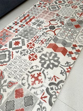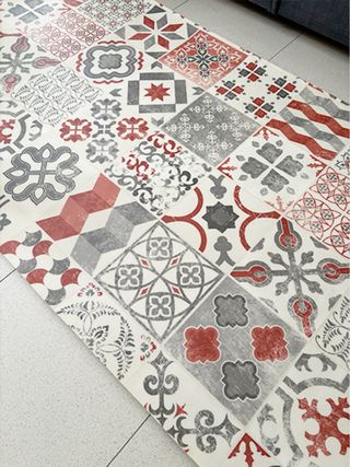 Suelo vinílico marca Tarkett. Estampado rajola hidràulica en tonos rojos y grises. Largo: 220cm Ancho: 90cm Grosor: 0,2cm