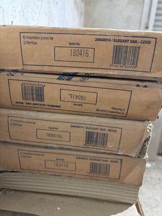 Se venden cajas de suelo vinílico Elegant Oak Beige. - Modelo: ID Inspiration Loose lay - Color: Beige - Cada caja cubre 2.79m² - Lote: 180416 8 cajas 22 metros cuadrados Algunas cajas están deterioradas, el interior en perfecto estado. Medidas 22,9x 121,9 cm. 4 milímetros de espesor aproximadamente Lote 250€