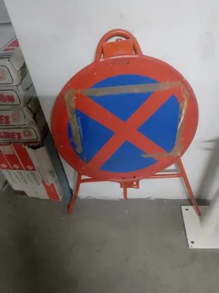 Dos señales de tráfico circular con el símbolo de prohibido aparcar. Una de pie sin soporte y otra con soporte triangular metálico rojo para suelo. Se pueden vender por separado. Precio por pieza