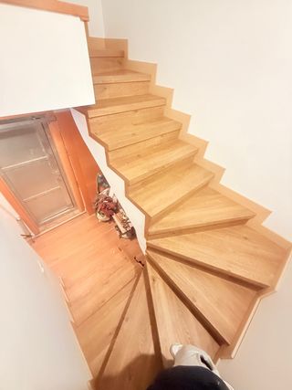 Escalera de madera de roble, diseño moderno y a medida. Perfecta para optimizar espacios. - Material: Madera de roble. - Diseño: A medida, con peldaños flotantes.