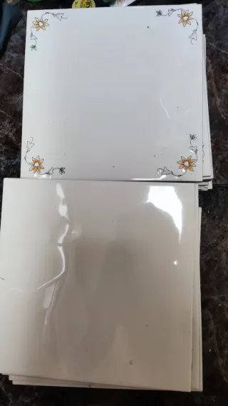 Conjunto de azulejos vintage con un bonito diseño floral en las esquinas. Son nuevos y están listos para darle un toque especial a tu espacio. - 30 azulejos Flores y hojas en tonos naranja y gris (25x25) - 34 Azulejos de color blanco (25x25) - 26 Perfiles tono mostaza tamaño (2,2x25) - 3 racholas de suelos color marron com vetas (44x44) Se puede vender en conjunto o separado.