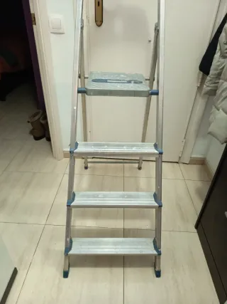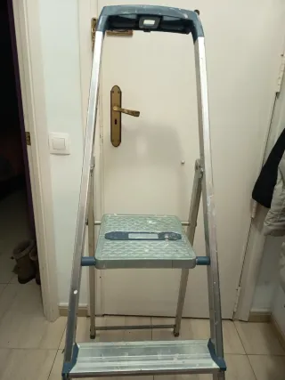 Escalera metálica plegable, ideal para tener en casa. Diseño plegable para fácil almacenamiento. Medidas: Abierta, del suelo al último escalón 77cm de altura Entera plegada, altura 1'46cm