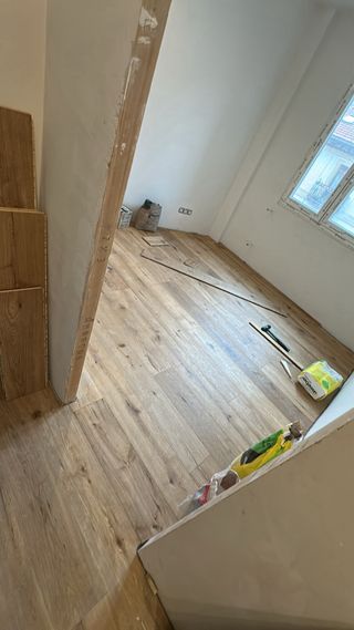 Se ofrece servicio de instalación de suelo laminado, incluyendo rodapiés y puertas. El trabajo se realizó recientemente y se aprecian algunos desperfectos en el suelo, como se ve en las fotos. - Incluye instalación de suelo laminado. - Incluye instalación de rodapiés. - Incluye instalación de puertas.