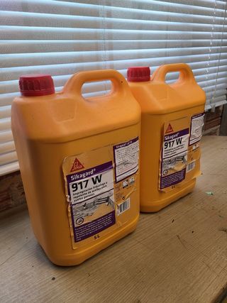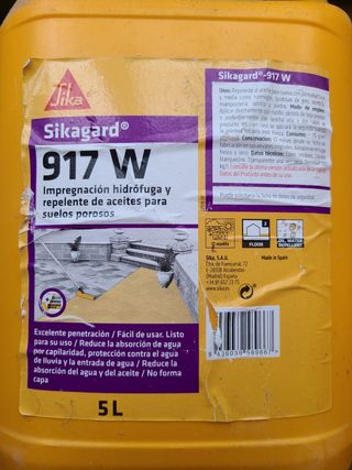 Se venden dos bidones de Sikagard 917 W sin abrir. Un producto diseñado para la impregnación hidrófuga y repelente de aceites en suelos porosos. - Ideal para proteger suelos de la absorción de agua y aceites. - Fácil aplicación. - Cada bidón contiene 5L.