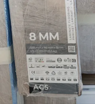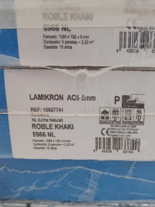 Vendo 10 paquetes de suelo laminado modelo Roble Khaki, con clasificación AC5 y 8mm de grosor. - Formato: 1285 x 192 x 8 mm - Contenido: 9 paneles por caja - Superficie cubierta: 2,22 m² por paquete