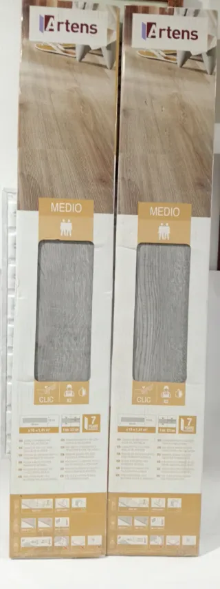 Se venden lamas de PVC para suelos de la marca Artens. - Modelo: Medio - Sistema de unión: Clic - Durabilidad: 7 años de garantía - Grosor: 4 mm - Cantidad: 7 lamas por paquete - Color gris - 2 paquetes