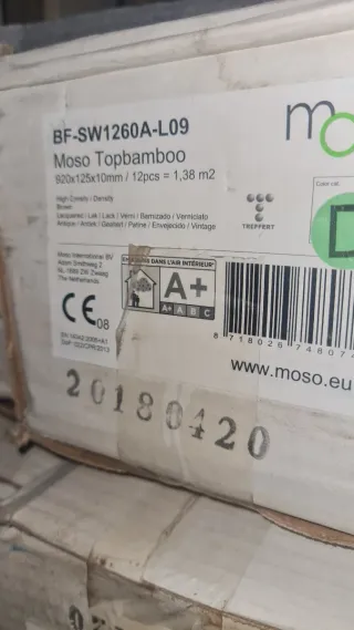 Suelo de bambú Moso Topbamboo en color Brown. Las lamas tienen unas dimensiones de 920x125x10mm. - 12 lamas por caja. - Cubre 1,38 m2 por caja. - Acabado lacado/barnizado. Se vende 15€ la caja.