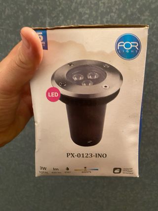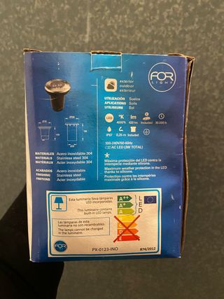 Foco de suelo para exterior con acabado en acero inoxidable. - Material: Acero inoxidable 304. - Protección IP67. - Incluye lámparas LED incorporadas. - No son recambiables. esta nuevo , la caja es la que está algo deteriorada.