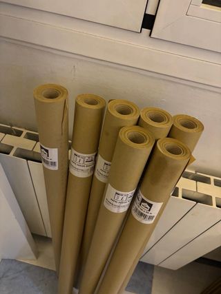 Rollo de papel de protección para suelos, ideal para obras o mudanzas. Es un papel resistente y fácil de usar. 90 cm x 20 metros - Gramaje: 50 gr. - Color: Kraft. 9 unidades, se venden todas juntas