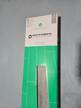 Se vende una caja se suelo vinilico tipo spc de 5mm de grosor y fácil montaje. En la última foto se puede ver una foto real de como me quedó montándolo yo en la cocina. Es resistente al agua, al fuego, a las manchas, a los impactos, desgaste, aislamiento acusticamente, antideslizante y un largo etc. Tenéis las características en la web del obramat