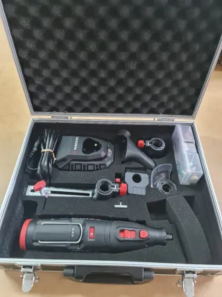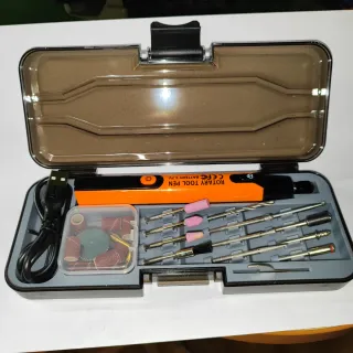 Mini taladro de precisión recargable por USB, ideal para trabajos detallados. - Incluye varios accesorios para lijar, pulir y taladrar. - Diseño compacto y ergonómico. - Batería de 3.7V.