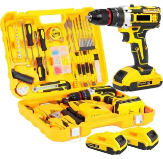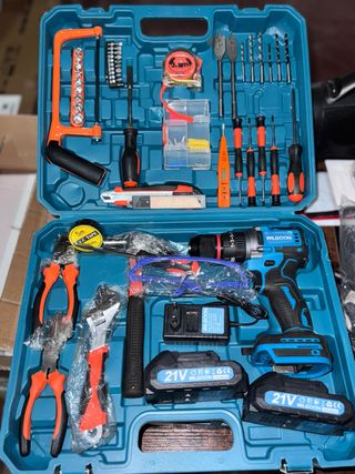 Set de herramientas eléctricas con taladro percutor a batería. - Taladro percutor inalámbrico. - Dos baterías de 21V. - Cargador. - Incluye maletín con accesorios: sierra, alicates, llaves, destornilladores, brocas y cinta métrica.