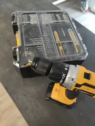 Taladro a batería Powerplus con su maletín de transporte y accesorios. - Incluye maletín con compartimentos. - Diversos accesorios para taladrar y atornillar.