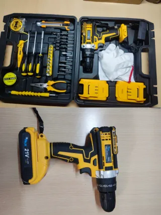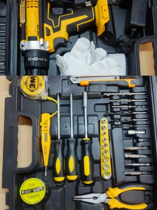 El kit perfecto para casa, garaje o reparaciones rápidas. Incluye una selección de herramientas de mano, ideal para tenerlo todo organizado y a mano. ⚙️ Características del Taladro: Potente motor: Ideal para taladrar en madera, metal y pared (con percusión). Batería de Litio de larga duración: Trabajo sin cables y carga rápida. Portabrocas automático: Cambio rápido de brocas y puntas. Velocidad variable y reversible: Control total para atornillar con precisión. Luz LED integrada: Para zonas con poca visibilidad. Maletín rígido de transporte con cierres de seguridad. 🆕 Estado: Nuevo a estrenar en su caja precintada. 📦 Hago envíos.