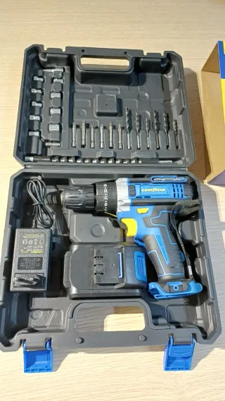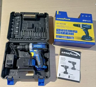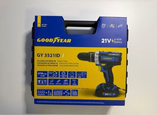 Taladro de impacto de la marca Goodyear, ideal para trabajos de bricolaje y profesionales. Incluye batería Li-ion, su maletín y accesorios. - Taladro inalámbrico con luz led. - Batería recargable Li-ion 21V 1,5 Ah. - Cargador. - Juego de brocas y puntas. - Dos velocidades. A estrenar.