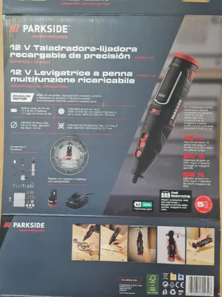 Taladradora-lijadora recargable de precisión PARKSIDE 12V. - Motor Brushless: duradero, potente y resistente a la abrasión. - Batería: iones de litio 12V (2 Ah). - Diámetro de disco máx.: 3,8 cm. - Velocidad de giro en vacío: 5000-32 000 rpm (6 niveles). - Diámetro de portabrocas máx.: 3,2 mm. - Incluye accesorios, batería y cargador.