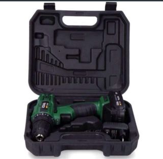 Taladro atornillador inalámbrico de color verde y negro, con accesorios. - Incluye maletín para transporte. - Dos baterías recargables. - Juego de brocas y puntas.