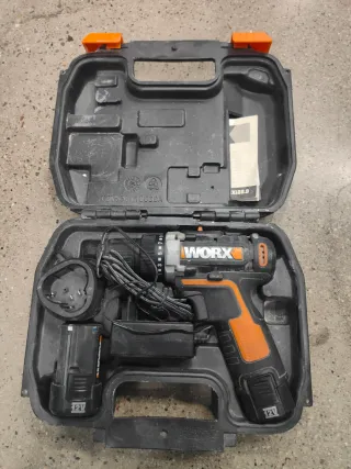 Taladro atornillador Worx con su maletín. - Incluye taladro, dos baterías de 12V, cargador y maletín. - Mango ergonómico para un mejor agarre. - Diseño compacto y ligero.