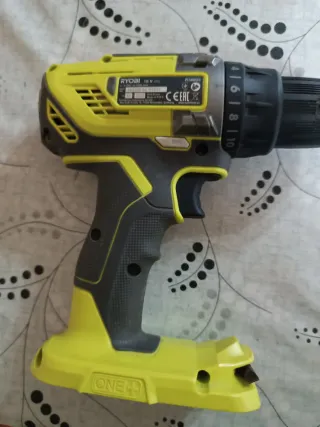 Taladro atornillador de la marca Ryobi, modelo 18V. - Color amarillo y gris. - Diseño ergonómico para un agarre cómodo. - Prácticamente sin usar. Modelo R18DD3