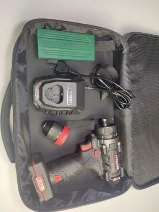 Set de taladro atornillador Parkside con accesorios. - Taladro atornillador inalámbrico. - Batería. - Cargador. - Juego de brocas. - Juego de puntas.