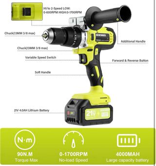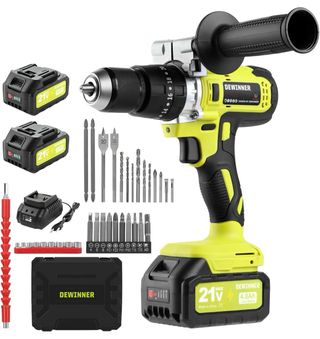 NUEVO! NUEVO! NUNCA USADO! Taladro atornillador inalámbrico Dewinner con batería de 21V y 4.0Ah. - Incluye dos baterías de 21V. - Cargador de batería. - Mango auxiliar. - Juego de brocas y puntas. - Maletín de transporte.