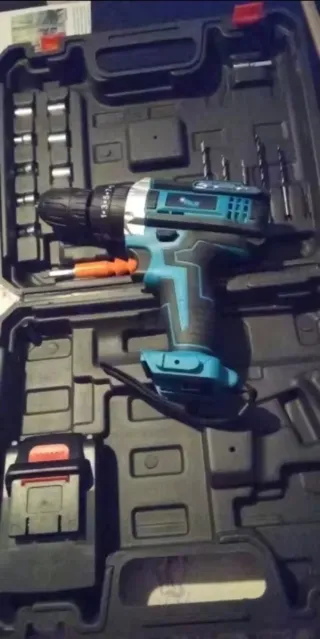 Set de taladro y atornillador a batería, ideal para trabajos en el hogar o profesionales. Incluye maletín y accesorios.atiendo watcha al número 604412715 nuevo sin usar - Taladro/atornillador inalámbrico. - Dos baterías recargables. - Cargador de batería. - Maletín de transporte. - Juego de brocas y puntas.