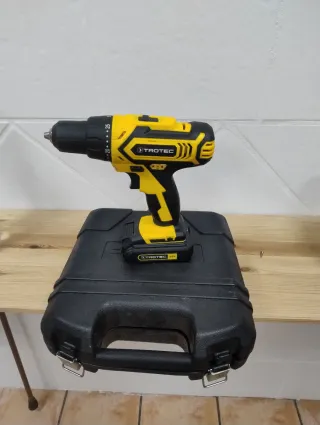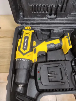 Taladro atornillador inalámbrico Trotec con maletín. - Color amarillo y negro. - Incluye batería. - Maletín de transporte negro.