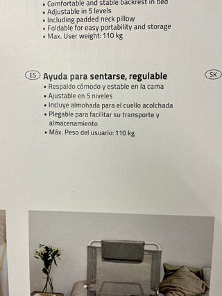 Nuevo a estrenar, en su caja. Ayuda para sentarse Ridder, ajustable. Comodo y estable en la cama. Incluye almohada para el cuello - Marco de metal. - Respaldo y reposacabezas de malla. - Patas antideslizantes. - 5 niveles. Soporta 110kg Tag: bosch, parkside, madera, hierro, cuchillas, bricolaje, DeWalt, Stayer, Black Decker, Worx, Lidl, circular, amoladora, taladro, radial, atornillador, martillo, lijadora, laser, impacto, 4 ah, jardin, cortacesped, piscina, rama, árbol, cortasetos, cesped, cargador, batería, 2 ah, taladradora, soplahojas, soplador, cepillo, impacto, banda, recargable, batteria, aspirador.