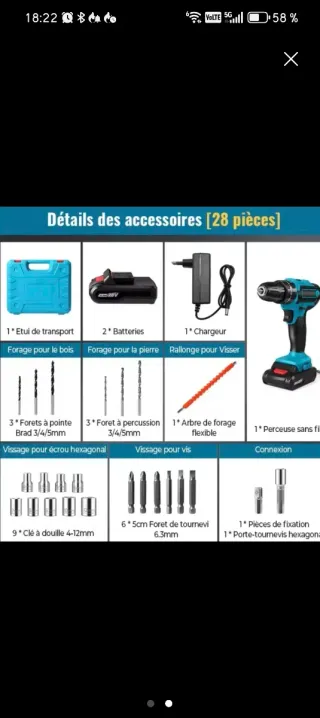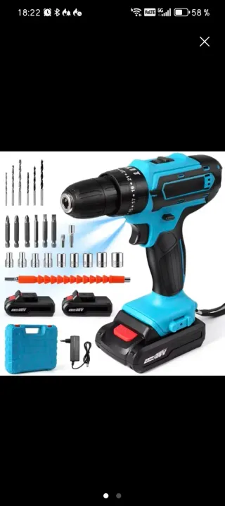 Maletín completo de taladro/atornillador/percutor inalámbrico ideal para bricolaje en casa o taller. Incluye taladro 21V, 2 baterías recargables de alta capacidad y cargador rápido. Múltiples accesorios: 3 brocas para piedra, 3 brocas para madera, puntas de atornillar, vaso de llaves de tubo, alicates, destornilladores, cúter, cinta métrica, cinta aislante y eje flexible extensible para zonas de difícil acceso. Velocidad regulable y función percutor para paredes. Todo organizado en resistente maletín de transporte. Nuevo sin usar