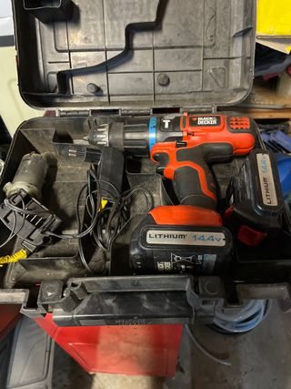 Taladro atornillador Black & Decker de 18V, ideal para trabajos de bricolaje. - Incluye maletín para transporte. - Dos baterías de 18V. - Cargador rápido. - Juego de brocas Bosch