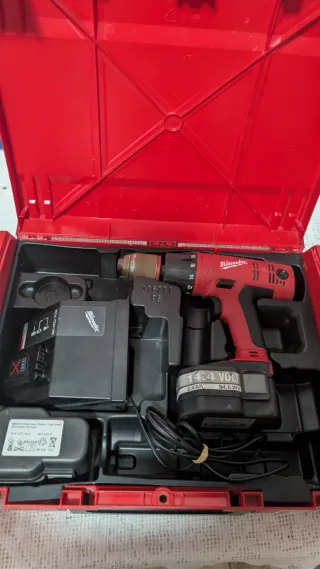 Taladro atornillador inalámbrico Makita en su maletín de transporte rígido original. El pack es muy completo e incluye: • Taladro atornillador Makita (usado, funciona). • Cargador rápido original Makita DC1414 T. • 3 Baterías (color rojo, modelo antiguo). • Caja de puntas ABC-BITS y tornillería varia. El equipo tiene marcas de uso evidentes pero mantiene la calidad profesional de la marca. Se vende por liquidación de taller. Ver más productos en mi perfil.