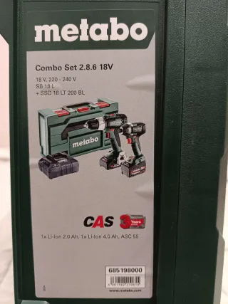 Set de herramientas Metabo Combo Set 2.8.6 18V. - Incluye taladro SB 18 L y atornillador SSD 18 LT 200 BL. - Incluye maletín. - Incluye 1x batería Li-Ion 2.0 Ah y 1x batería Li-Ion 4.0 Ah. - Incluye cargador ASC 55. No se aceptan ofertas,gracias
