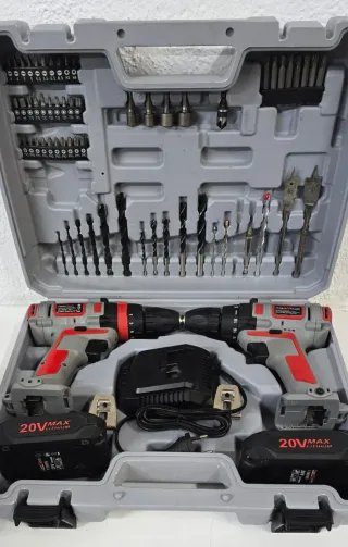 Este kit incluye un taladro percutor y atornillador, junto con una variedad de accesorios. - Dos taladros/atornilladores inalámbricos. - Baterías de litio de 20V MAX. - Cargador de batería. - Amplia selección de brocas y puntas.