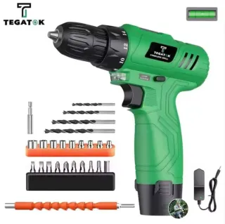 Taladro atornillador con percutor TONFON de 12V, ideal para trabajos en el hogar. Incluye cargador y batería. - Taladro atornillador con función percutor. - Batería recargable de 12V. - Cargador incluido. - Maletín para transporte y almacenamiento. - Juego de brocas y puntas.